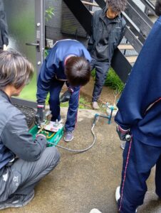 実際に水道配管のミニチュア版を作り、水圧をかけ蛇口から水を出すまでドキドキでしたが、図面通りに完成し、水圧試験も全員合格。蛇口から水が出て感激の様子でした。